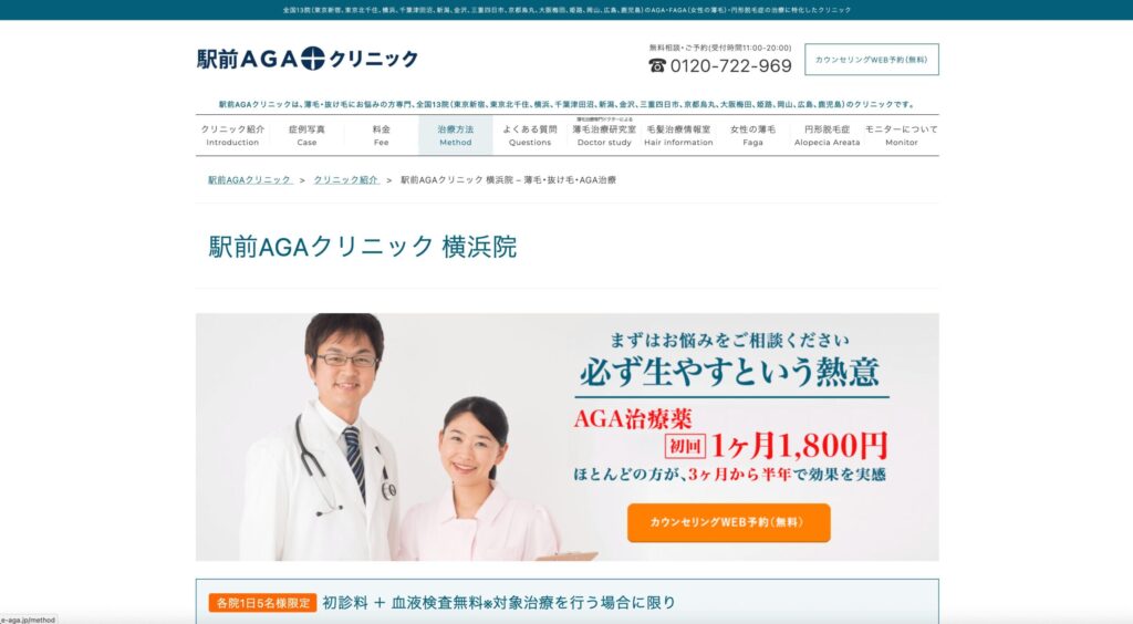 AGAヘアクリニック(AHCメディカルサロン横浜)は、独自のAGA治療薬と育毛サプリメントと幅広く頭皮ケア商品を取り扱っている横浜エリアのおすすめクリニックです。