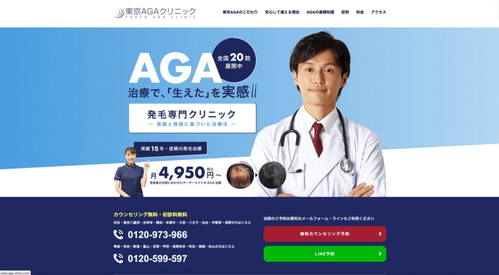 AGAヘアクリニック![]() | ▽フィナステリド1mg 初回:1,800円〜 2回目以降:3,600円 | ▽フィナステリド・ミノキシジル配合内服薬 10,800円〜 | 10:00〜22:00 | 無料 |